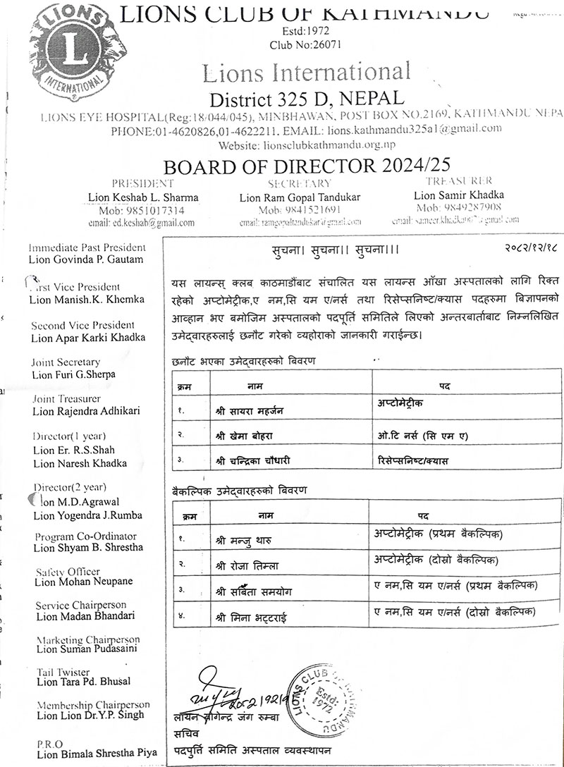 It is my great honor to be appointed as the President of Lions Club of Kathmandu 2025–2026. I hope this year is filled with Joy, Love and Peace. Let’s hope Joy fills our hearts, Love brings our hands together and peace inspires us to serve the community.